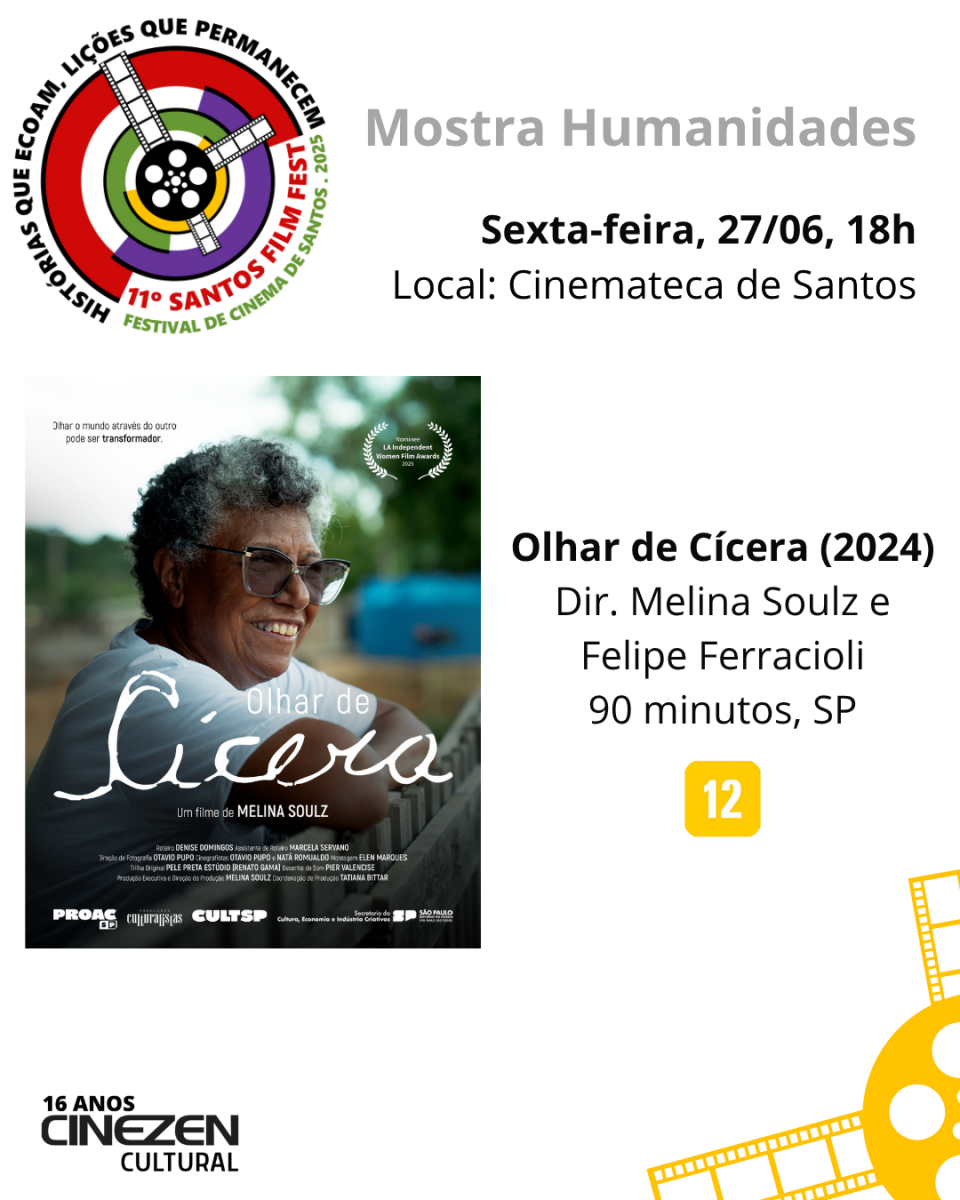 A Cinemateca de Santos promove exibições até sábado (28), dentro do ‘Santos Film Fest’. A Mostra Humanidades, com oito curtas e oito longas-metragens brasileiros recentes e inéditos em Santos, ocorre sempre em sessões às 16h e às 18h. Na sexta-feira (27), além destas sessões, o local recebe a Mostra Universitária, com curtas de diversas regiões do Brasil, às 21h, e depois a tradicional Virada Cinematográfica com Café da Manhã, a partir das 23h30. Na ocasião, o público poderá conferir três clássicos inesquecíveis preferidos de Maurice Legeard, ícone do audiovisual santista. Para saber a programação completa acesse: https://santosfilmfest.wordpress.com/ ou no Instagram da Cinemateca, pelo @cinemateca013.