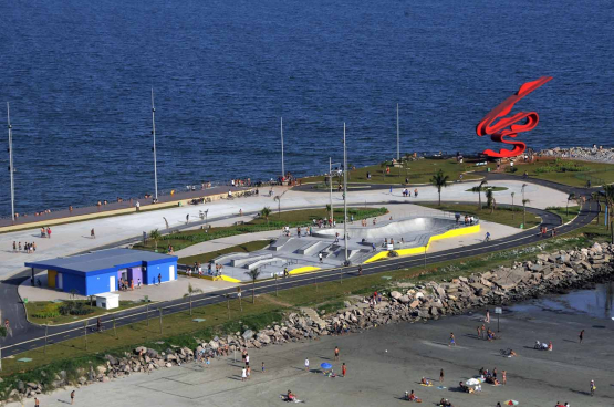 O ônibus da Rota Verde parte do Parque Roberto Mario Santini, também conhecido como novo Quebra-mar. No parque, estão instalados Espaço Criança, pista profissional de skate com 1.100 m², ciclovia, mesas ao ar livre para jogos, gibiteca, arquibancada com capacidade para 600 pessoas junto ao quebra-mar, torre de observação para jurados em competições de surf, e áreas de convivência e de contemplação. Há também pistas para cooper e caminhadas, ciclovia e quadra de malha. O projeto do arquiteto Ruy Ohtake, inaugurado em 2009, atende às normas de acessibilidade para pessoas com deficiência.