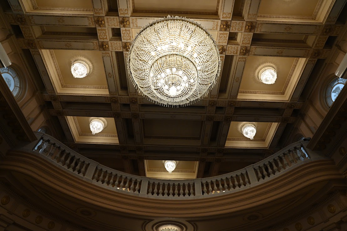 A fachada é marcada pelas estátuas de Minerva e Mercúrio, esculpidas por João Batista Ferri, além de detalhes internos como mármore italiano, jacarandá, vitrais e lustres de cristal da Boêmia.