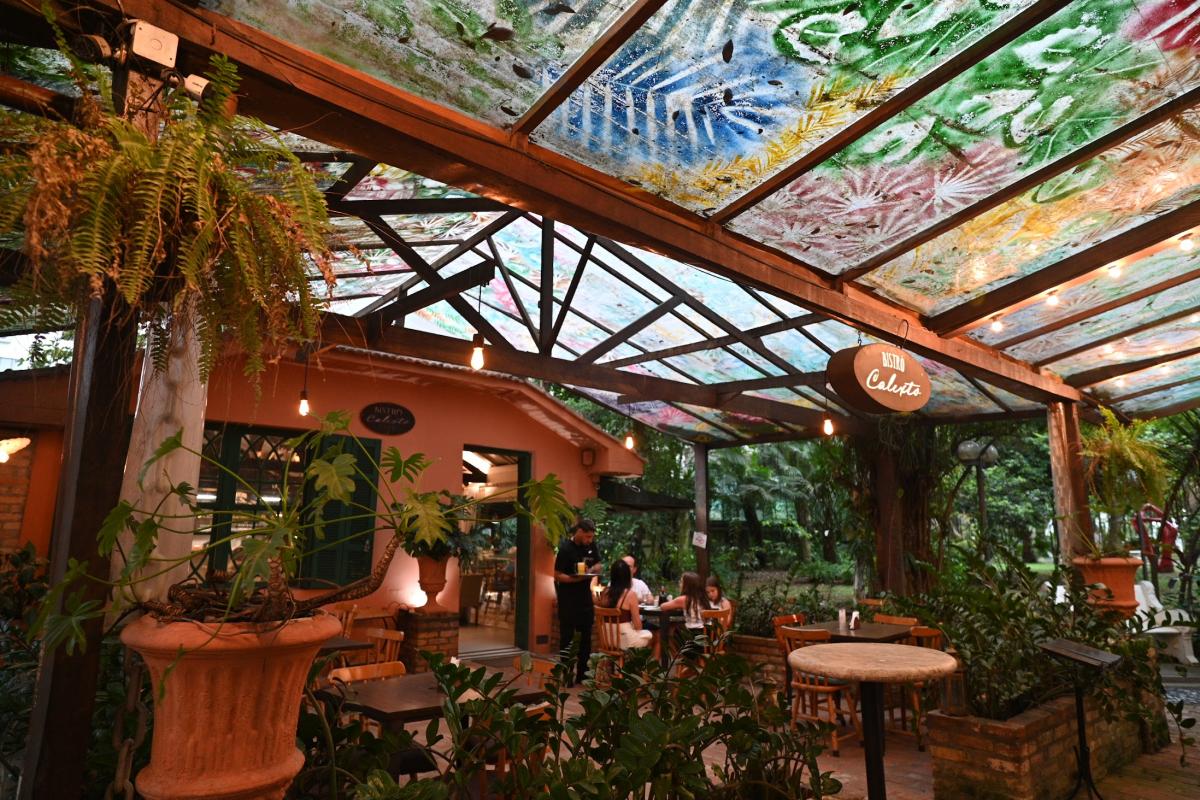 Ao sair do casarão, o visitante encontra um amplo jardim com esculturas e obras feitas a partir de materiais sustentáveis, cercado por espécies como ipê-amarelo, mangueira, pau-brasil, palmeiras-de-leque e strelitzias, que emolduram o espaço com cores e sombra. Nos fundos do terreno está o Bistrô Calixto, em funcionamento há seis anos, com cardápio variado que inclui pratos como mignon cucurbita, mignon giardino, frango roxo, risotos e peixes, além de cafeteria e sobremesas para um agradável chá da tarde.